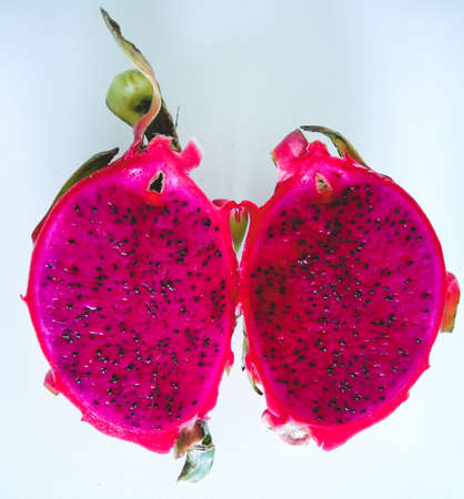 Red and pink dragon fruit slice with red and white flesh. The pitahaya fruit is low in calories, rich in essential vitamins and minerals, and contains dietary fiber.