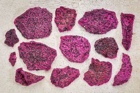 slices of dried red dragon fruit against rustic white painted wood