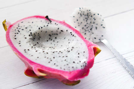 Dragon fruit on pink background. Healthy food concept. Tropical fruit.