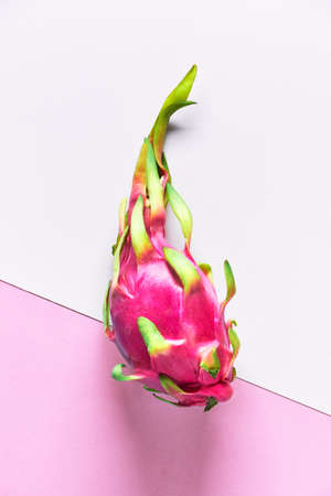 Creative flat layout with dragonfruit (pitaya or pitahaya) on two tone double color paper, white and pink background. Top view, flat lay of the whole fresh ripe fruit ready to eat.
