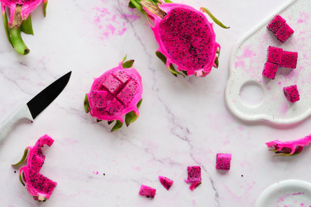 Ugly food. Juicy pink dragon fruit, pitaya, pitahaya sliced on marble table. Trendy top view, flat lay of dragonfruit pieces and shavings with smeared juice and kitchen knife.