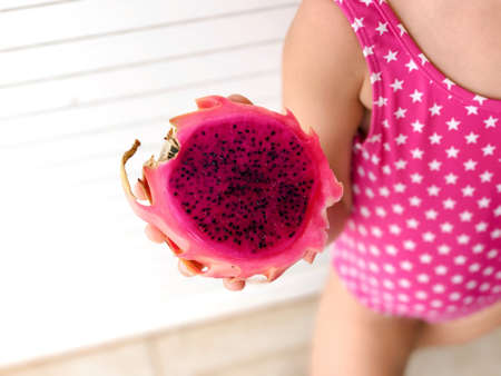 Sliced pitaya fruit. Half of the pitaya is in the hand of a man. Dragon fruit of the Hylocereus undatus species. The view from the top.