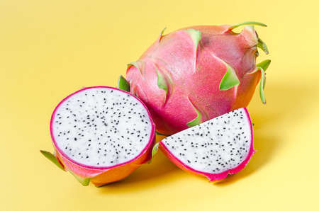 Half dragon fruit or pitaya on yellow background, Tropical fruit