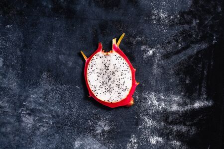 Dragon fruit. Vibrant Dragon Fruit on black background. Sliced white dragon fruit or pitaya on black plate on the table, close-up. Tropical and exotic fruits. Healthy and vitamin food concept.