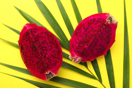 Delicious cut red pitahaya fruit with palm leaf on yellow background, flat lay