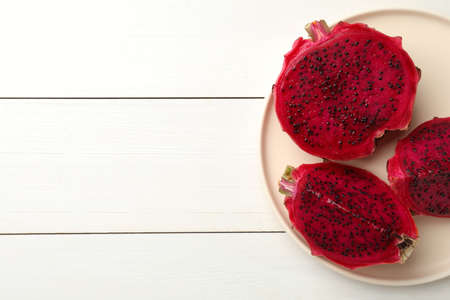 Plate with delicious cut red pitahaya fruit on white wooden table, top view. Space for text