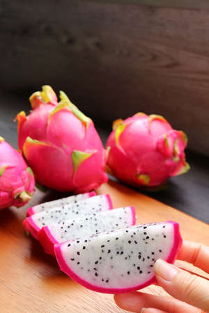 Dragon fruit or pitaya on wooden background, Tropical fruit, Table top view