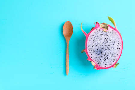 Half dragon fruit or pitaya and wooden spoon for eating on color background with copy space, Tropical fruit