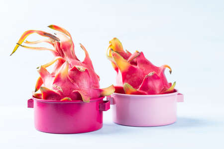 Exotic fruit Dragonfruit with pink and blue backgroundtop view. Dragon fruit or pitahaya studio photo. Sweet tropical fruit.