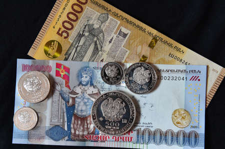 Small Ukrainian coins isolated on black background. Close-up view.