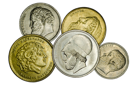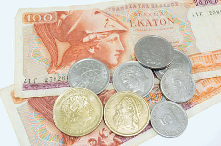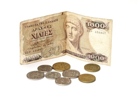 greek drachma bandnote and coins isolated on white background