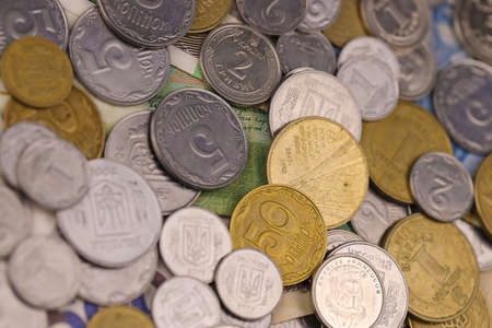 Ukrainian kopiika coins close up. Big amount of ukrainian money on table. Business and stock concept for Ukrainian currency
