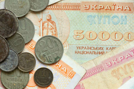 monetary unit of the Ukrainian state coupon and coins of the ussr lie on the table, old soviet money, coins and coupons, finance