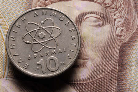 Greek drachma coin on banknote