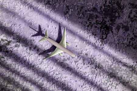 creative effect with sun light beam, airplane aircraft toy on purple violet background with lines, travelling concept
