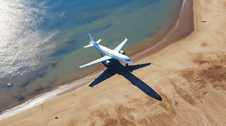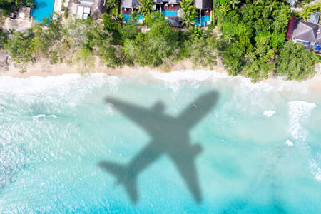 Aerial view of airplane shadow on seaside beach travel concept with stunning perspective