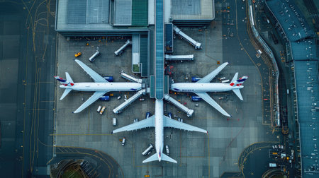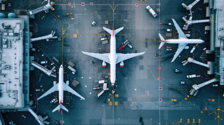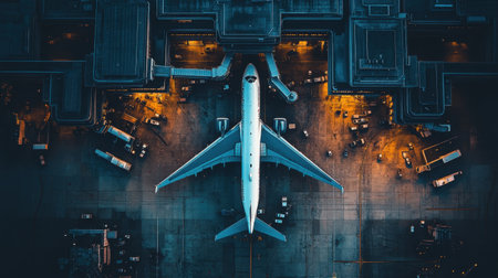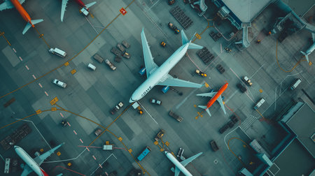 A bird's-eye view of an airplane parked at the gate in a bustling airport, with ground crew and vehicles preparing for departure.