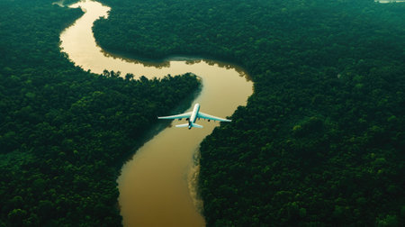 A lake in the shape of an airplane in the middle of untouched nature - a concept illustrating the ecology of air transport, travel and ecotourism. 3d rendering.