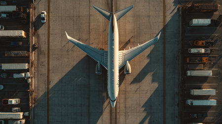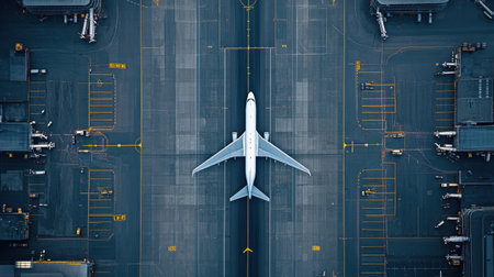 An overhead shot showcases a commercial aircraft positioned on a concrete surface. The image features the airplane's wings and fuselage, with surrounding elements suggesting an airport environment. The composition emphasizes symmetry and detail. Suitable for travel or transportation related projects.