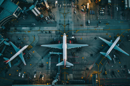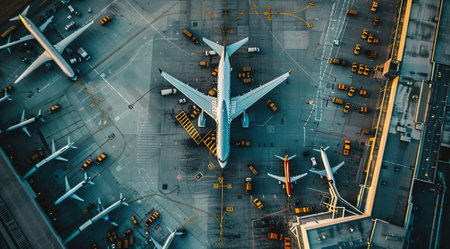 Aerial view of busy airport with planes taking off and landing, representing dynamics of air travel.