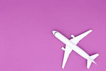 Toy model of plane on blue background with purple circle. The concept of tourism, air travel, minimalism. Top view