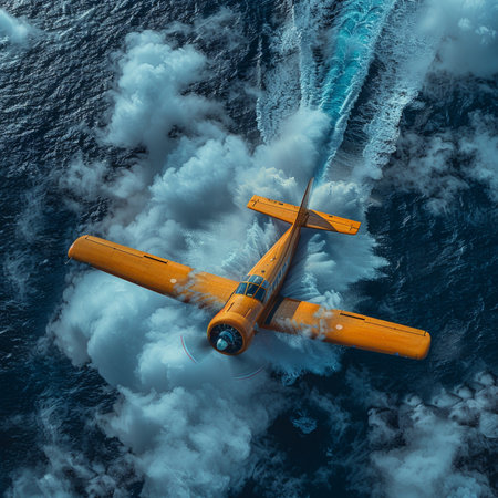 Aerial view of a yellow airplane in the middle of the sea