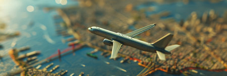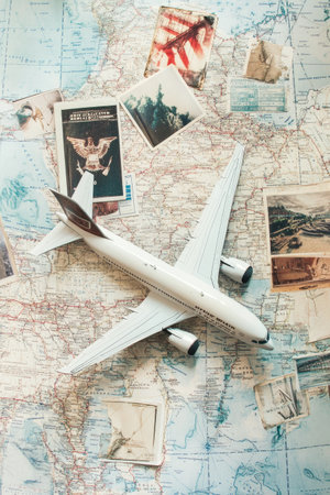 Plane toy on map background. Travel concept. Selective focus. Toned.