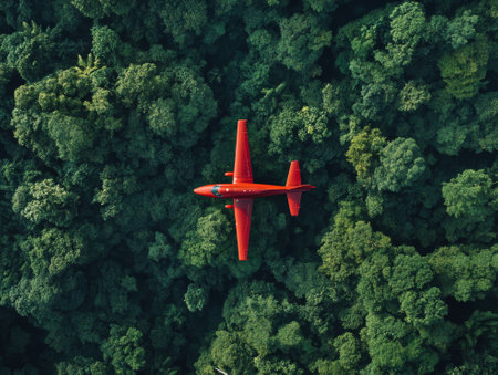 Red plane flying over lush green forest - ai