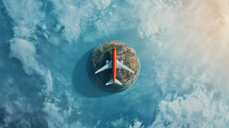 Red and white passenger airplane flying over a small planet earth partially covered by clouds, representing global travel, business trips, and international transportation