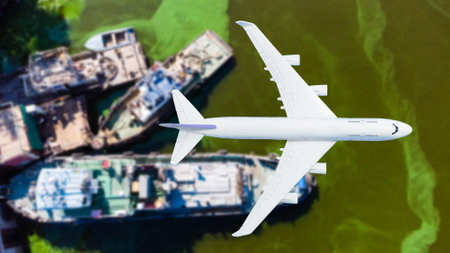 Aerial view of a flying airplane in the sea. Top view.