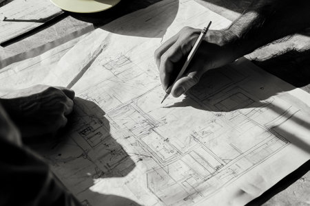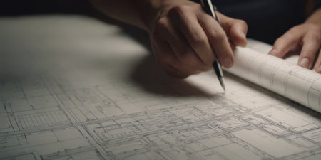 Focused engineer sketching a project layout on large blueprint paper in a creative workspace. Highlights construction industry and technical expertise.