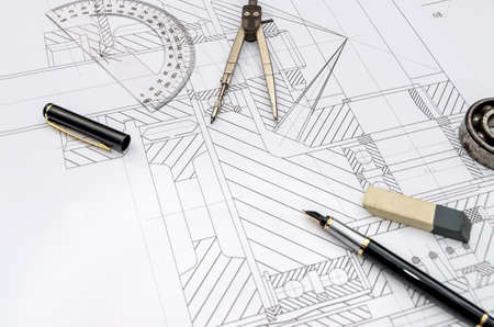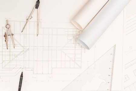 Architecture Engineer Drawing and working for architectural project and engineering tools on workplace, concept of work on technical drawings and construction.