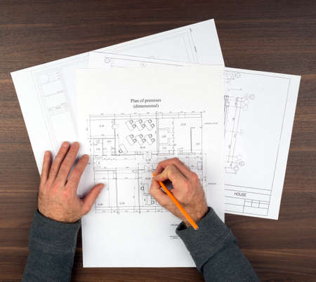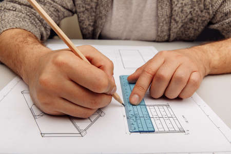An architect, a home design engineer, is drafting a house plan for a client in his office. He is writing a house plan based on the needs of his clients. House building and interior ideas.