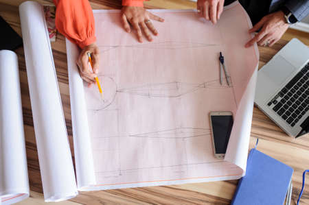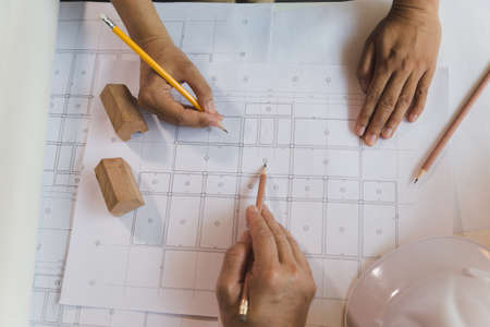 Close up with the hands of two architects sketching something in a house plan. blueprints and team work