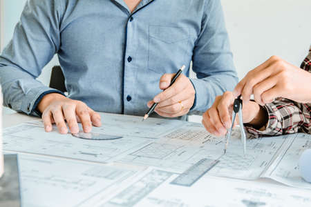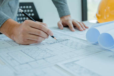 group of professional architect or interior designer hands drawing with pencil on blueprint on desk in meeting room office at construction site, construction industrial, engineering business concept