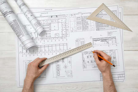 Architects workplace. Man working on blueprint