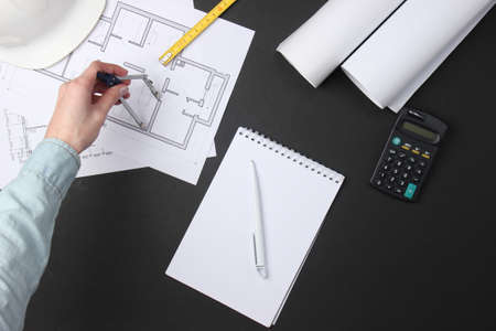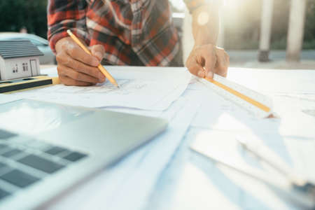 An engineer is using a tape measure to measure the plans of the house that he designs, the drafts the house drawings to build the correct standard. Engineer concept.