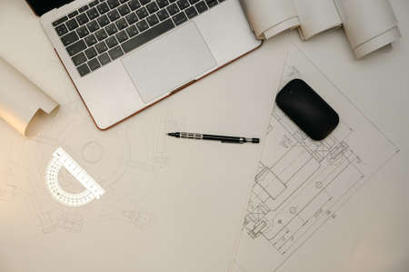 New project development, engineer workplace. Top view