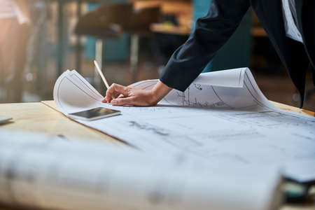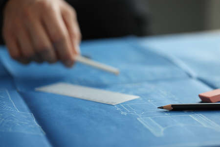 Architect working on blueprint at office desk, closeup. construction concept