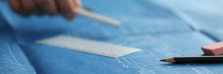 Architecture drawing project with pencil on blueprints with cropped shot.