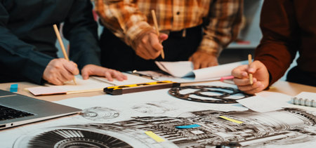 A sketching and writing on large blueprints, hands engaged in creative work, collaboration evident