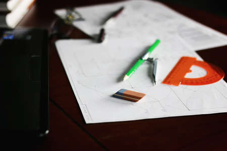 Architectural drawing on the table with pencils, ruler and compasses