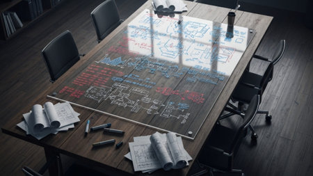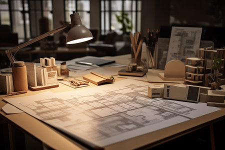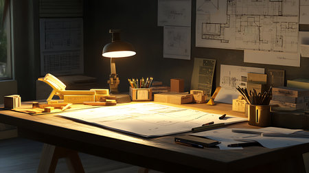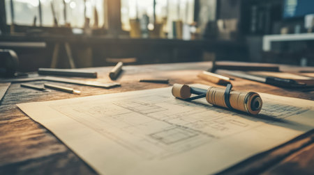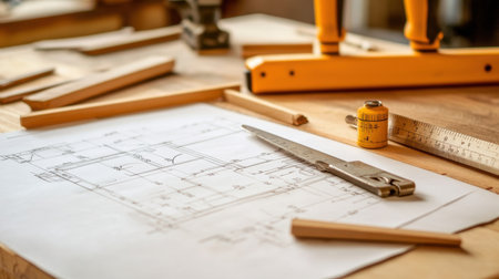 A captivating depiction of an architectural blueprint spread across a designer table, accompanied by drafting tools, pencils, and a creative workspace atmosphere ideal for professionals.