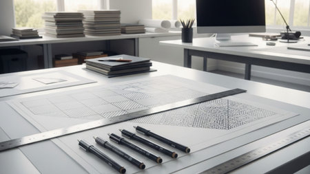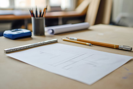 A clean desk setup with sketching paper, pencils, and measuring tools.