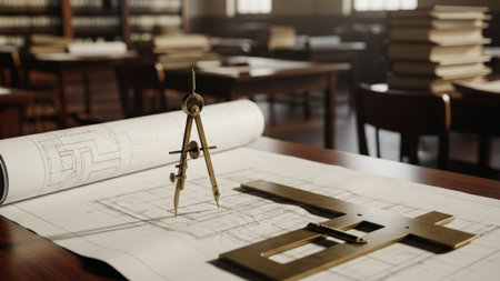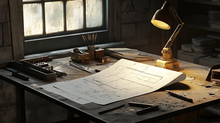 A vintage drafting table showcases detailed blueprints alongside various drafting tools in a warm, rustic workspace, perfect for design projects and artistic endeavors.