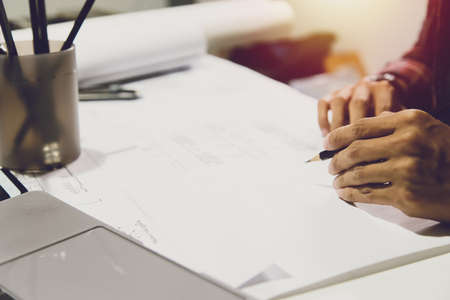 Concept architects,engineer holding pen pointing equipment architects On the desk with a blueprint in the office, Vintage, Sunset light.Selective Focus
