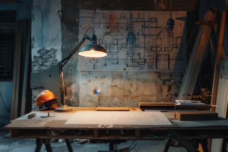 Architectural project desk with mining light in construction site or office building