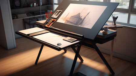A bright and inviting creative workspace featuring drafting tools, blueprints, and a wooden table, perfect for inspiration and artistic endeavors in design and architecture.