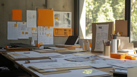 A bright and organized workspace filled with papers, sticky notes, and creative tools in a natural light environment, ideal for design and productivity.
