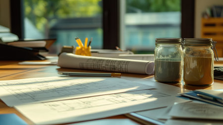 A serene workspace featuring blueprints, glass jars, and stationery on a wooden desk, illuminated by warm natural light and surrounded by lush greenery, ideal for creative planning.